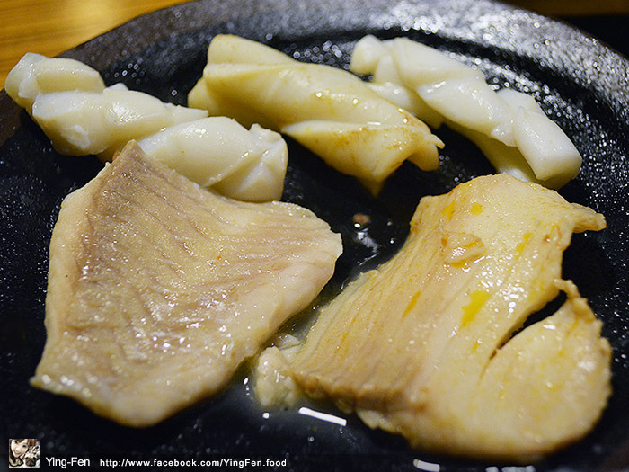 花枝有切過,煮的時候切過的花紋很明顯,口感有彈性很不錯吃;鯛魚片建議放在湯匙上面煮,這樣比較不會散掉,肉質很嫩有魚的鮮味。