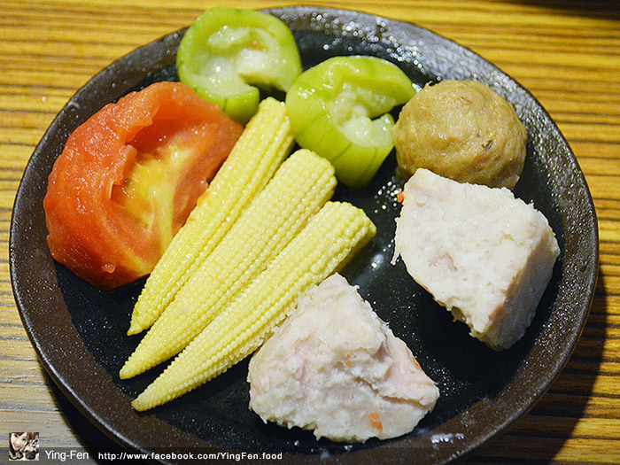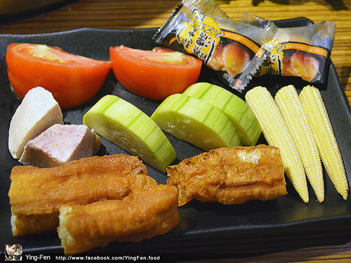鍋物、丸類和蔬菜類有番茄、芋頭、絲瓜、玉米筍、老油條和爆濃起司球。