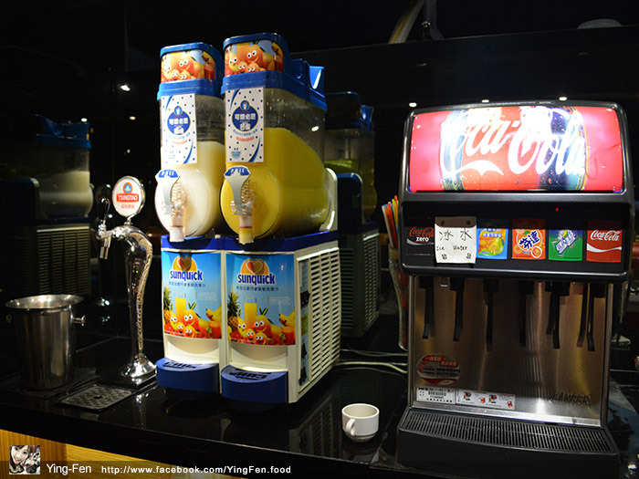 最左邊是青島啤酒,中間是水果冰沙,右邊是可樂。