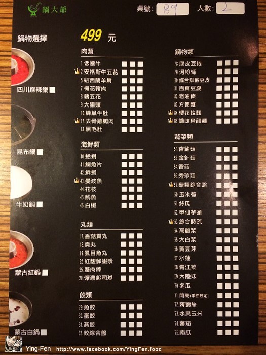 桌上菜單,左邊是火鍋湯底有五種,右邊是火鍋配料。