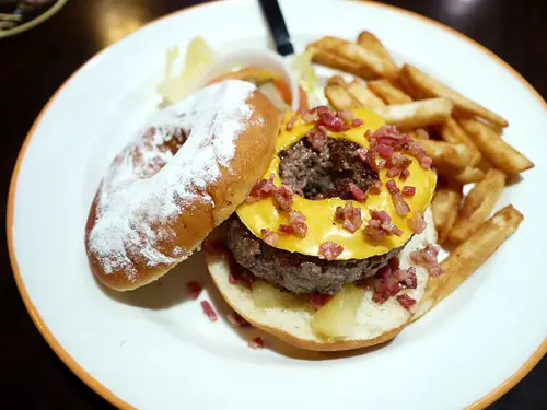 牛肉起司漢堡,超單純什麼醬都沒有加,生菜、洋蔥跟蕃茄切片也是放在一旁,真的是簡潔有力,有點厚度的牛肉加上已融化的起司,夾上生菜與洋蔥,熱呼呼的漢堡在手心,一口咬下就是滿足,麵包的軟、牛肉的味、起司的鹹、洋蔥的脆,體驗原味還不錯,雖然沒美味多汁跟驚奇感,但適合小酌休憩或是吃點好一點,打著道地美式漢堡,問我像不像,我沒去過美國我也不知道…