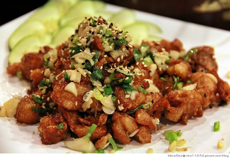 剛炸好的小塊雞肉,配上蔥、蒜一起拌炒,最後再灑上芝麻粒提味