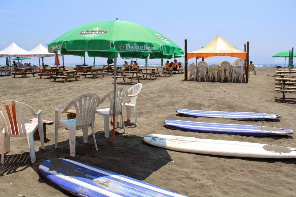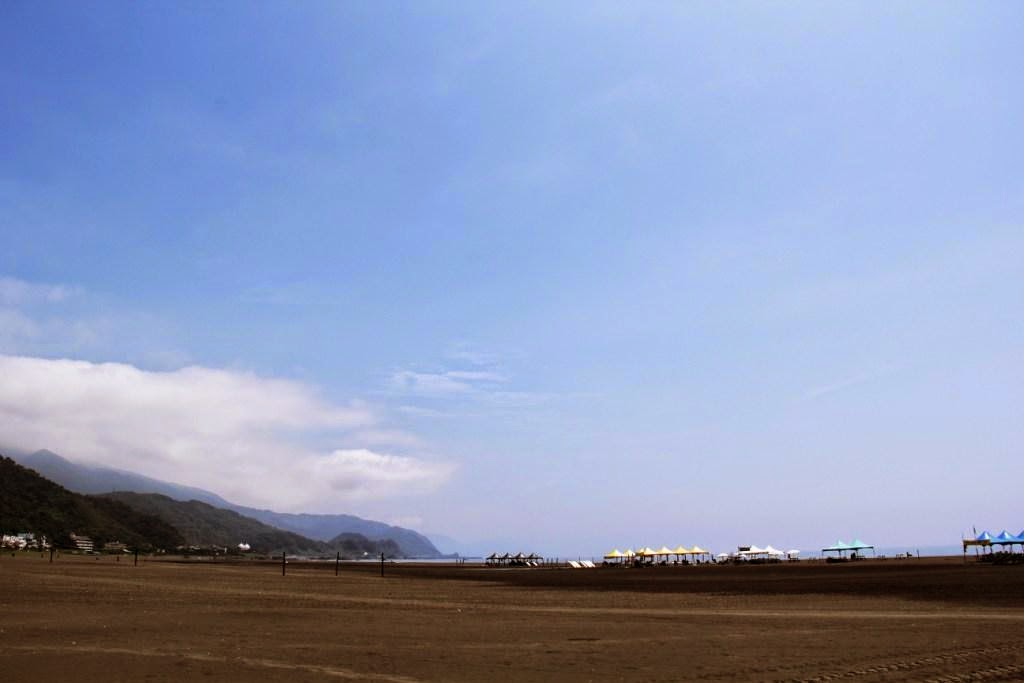 沙灘邊可以看到不少衝浪店都有遮陽傘在,