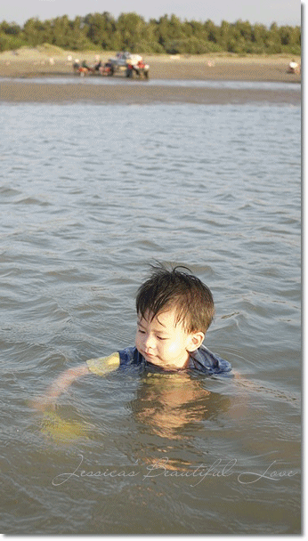 因為沙灘有高有低,所以水的深淺也有不同,於是Jasper可以有"游泳"的感覺呢!!