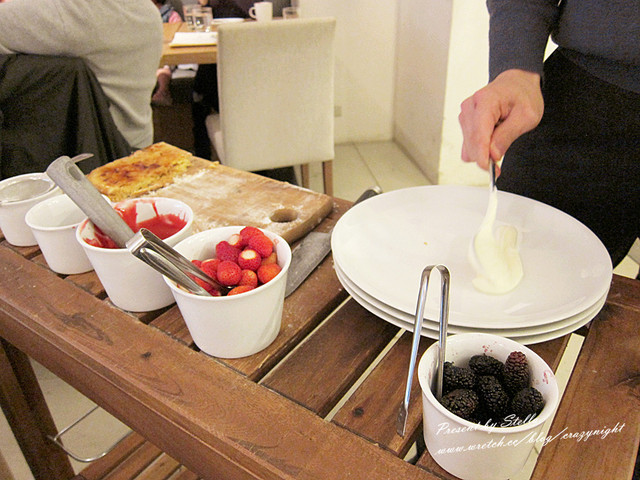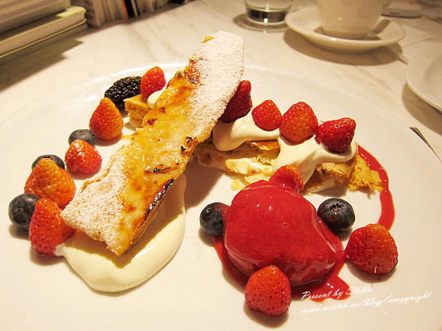經過服務生的巧手打造,層層堆疊,一層千層派,一層卡士達醬,上面擺上草莓、藍莓