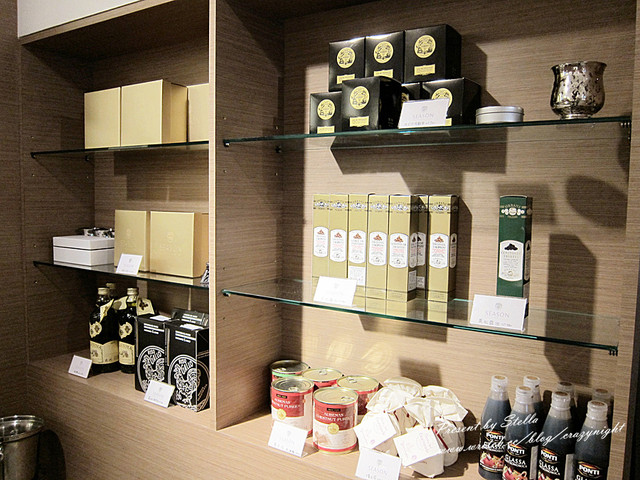 甜點櫃旁有個架上有賣店內的伯爵茶、橄欖油、松露醬、禮盒…