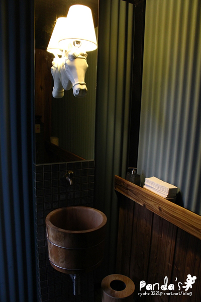 進到洗手間,燈飾還是小馬,水龍頭則是木頭水桶,顛覆了我的視覺。