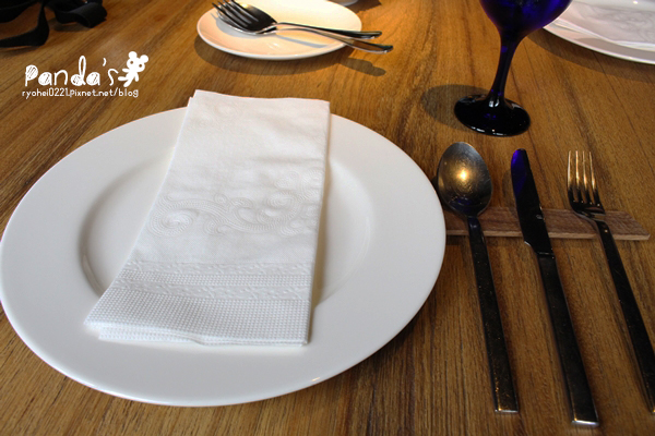Buono Bella桌上除了擺放花盆與藍調水杯外還有盤子和餐具組。