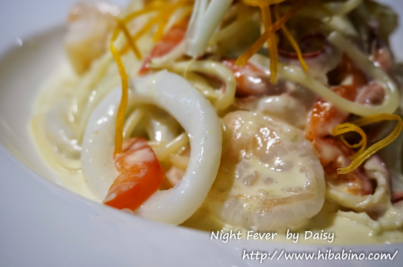 這義大利麵裡的用料很實在,滿滿的海鮮有蝦子和花枝外,還有健康的甜椒、紅蘿蔔絲...等蔬菜。