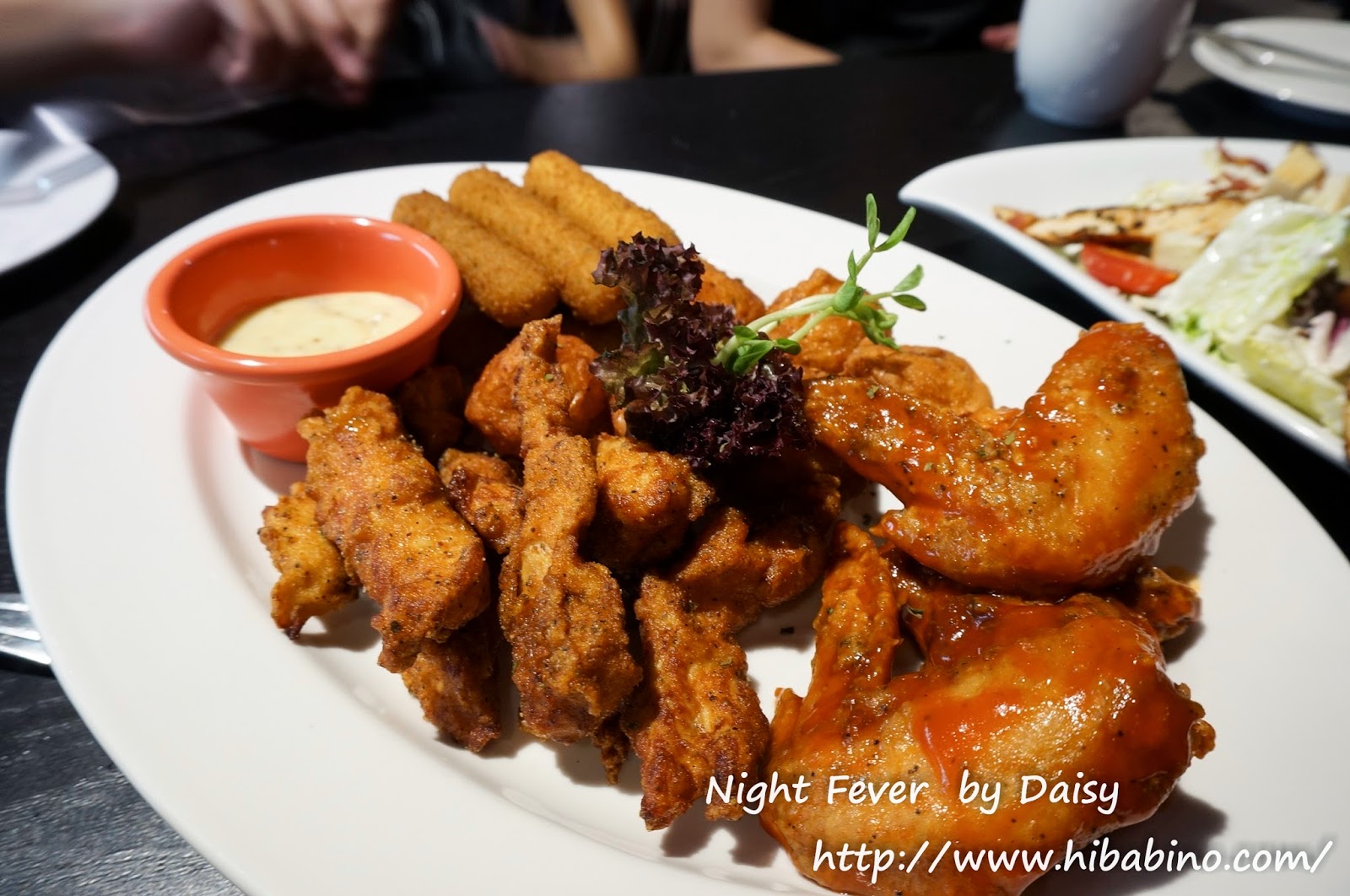 走美式餐點的夜店,當然有一個的人氣拼盤有雞翅、雞柳條、花枝丸和起司條四種。