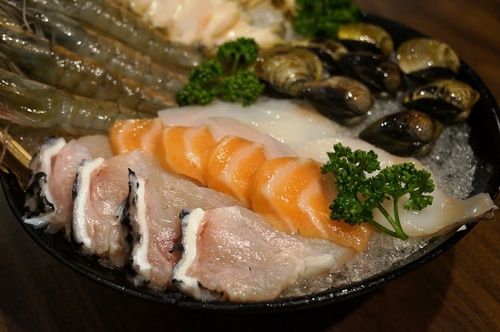 搭配鮭魚生魚片、野生龍膽石斑等兩種魚片,