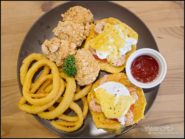 ▼ 從上而下分別是起司醬、水波蛋,鮮蝦+蕃茄,最下面是滿福堡包,而且是有沾過蛋液去煎的那種