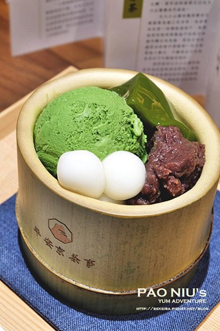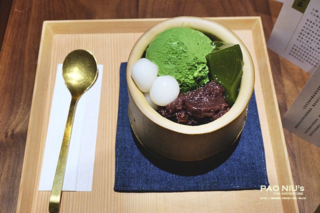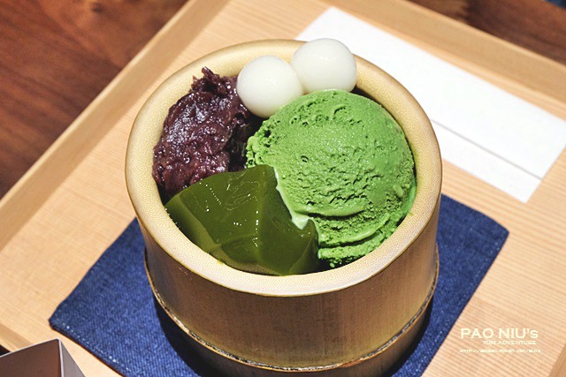 以孟宗竹製作打磨為容器,盛著抹茶寒天,抹茶冰淇淋、紅豆和白玉,