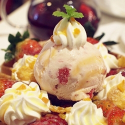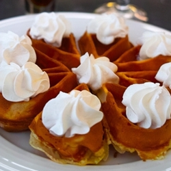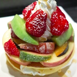 由小鬆餅層層堆疊而上,不僅長相可愛,吃起來也很方便,淋上煉乳及糖霜之後,甜度雖高但卻不顯膩,尤其表層有微微烤過、像焦糖布丁表面那層糖漿的脆硬口感,愈吃愈覺得它的迷人之處呦!建議可以沾著冰淇淋一塊享用,更有冷熱交融的層次感。