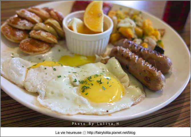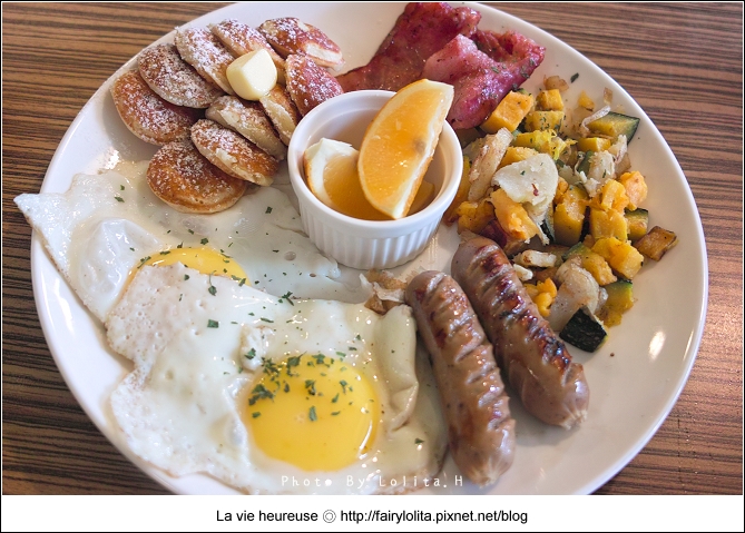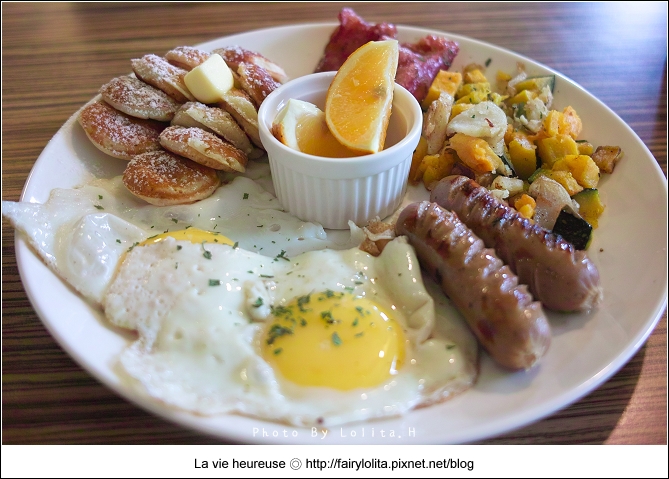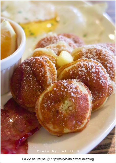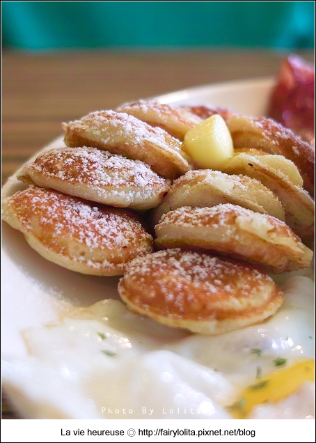 吃了那麼多早午餐,這還是頭一次看到麵包是用荷蘭小鬆餅的耶!澎鬆的口感,吃起來像富含空間般輕盈,除了灑上細白的糖砂點綴,上頭還有塊超邪惡的半融奶油。我喜歡沾著融化奶油的滋味,甜甜的,又帶了點鹹味,不膩又好吃。