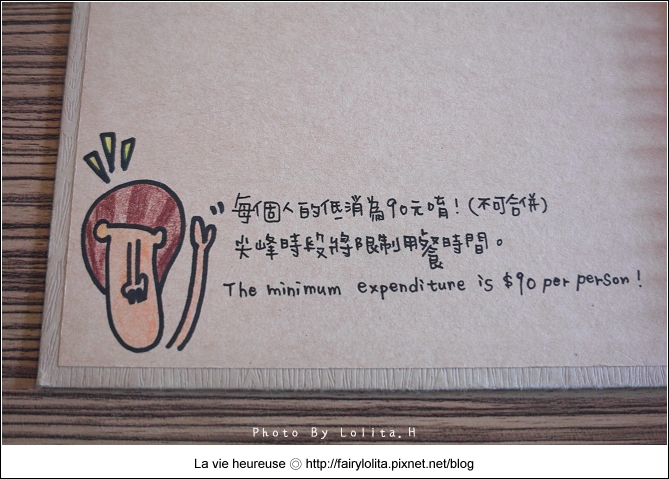 每人低消90元,平時不限用餐時間,不過我們這天去人頗多的,就有用餐2小時的限制。
