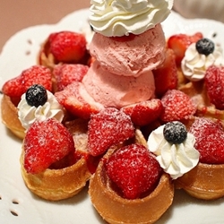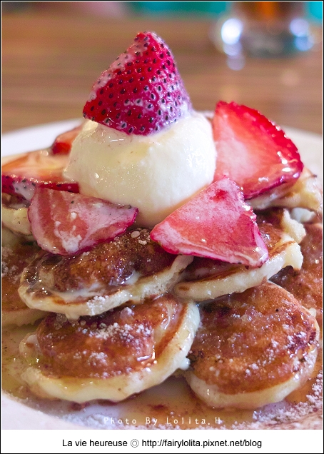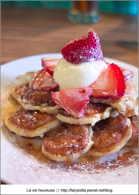會來這兒,完全是為了荷蘭小鬆餅的甜點,不過它們家的選擇頗多,一時之間還真不知要吃哪種口味XD,要不是我們只有二個胃,還真有種全部都點的衝動呢!後來選了店員推薦的焦糖布丁草莓,可愛的長相,一上桌就讓我們驚呼連連 >///<
