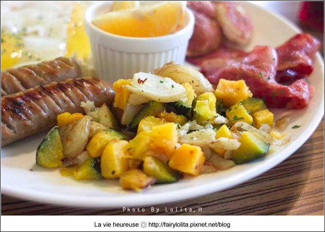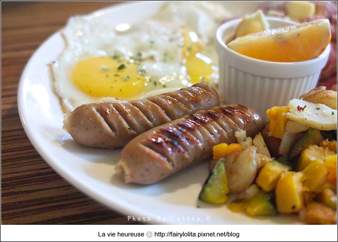 由德國香腸、太陽蛋、培根、炒南瓜及水果組成,麵包有農夫麵包、烤英式吐司、法式吐司及荷蘭小鬆餅四選一。