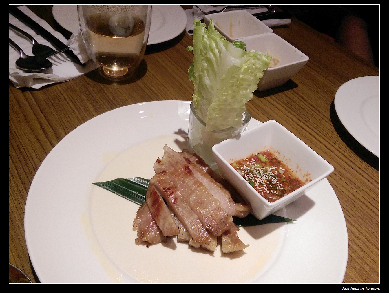 煙燻松阪豬, 微微帶著煙燻香氣的松阪豬, 包上羅曼, 淋酸甜醬 再加點白飯, 這是當天羅主廚教的吃法唷~