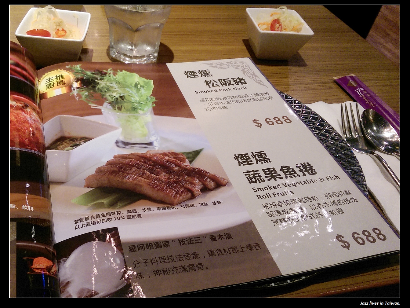 這兒是價位在688的煙燻松阪豬與醃燻蔬果魚捲,