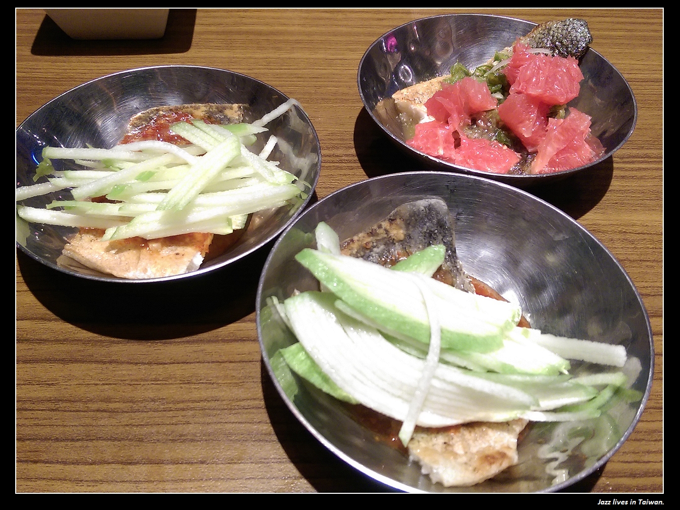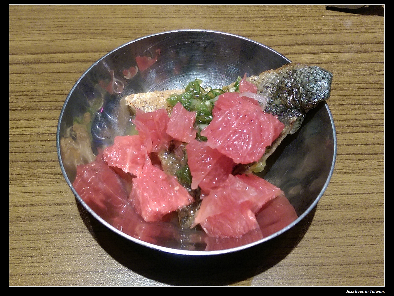 三味水果魚, 芭樂, 青蘋果, 葡萄柚搭配新鮮貴妃魚, 主廚羅阿明特地親自上桌提醒我們說: 酥酥的魚皮是特色, 還有要魚連皮搭水果一起吃~