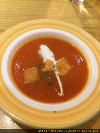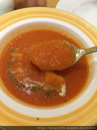 今天日濃濃的番茄湯配上三塊小麵包,整個很開胃,雖然我個人私心偏愛奶油系列產品。