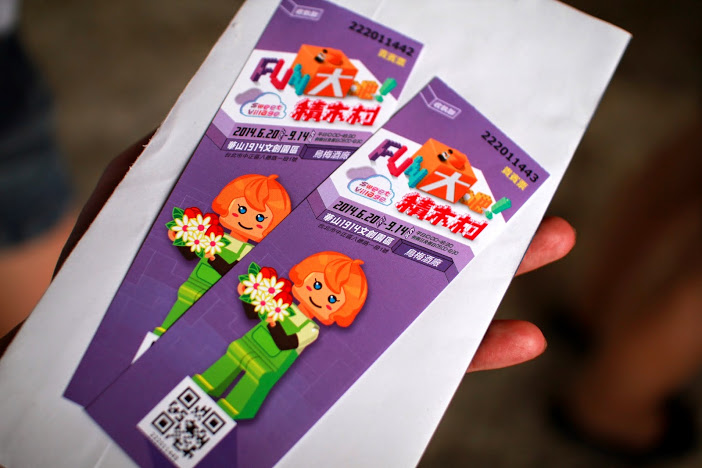 紫色底的門票(貴賓卷),上頭有Fun大吧!積木村,下面有QR-CODE 適合搭配安裝特展的APP所使用