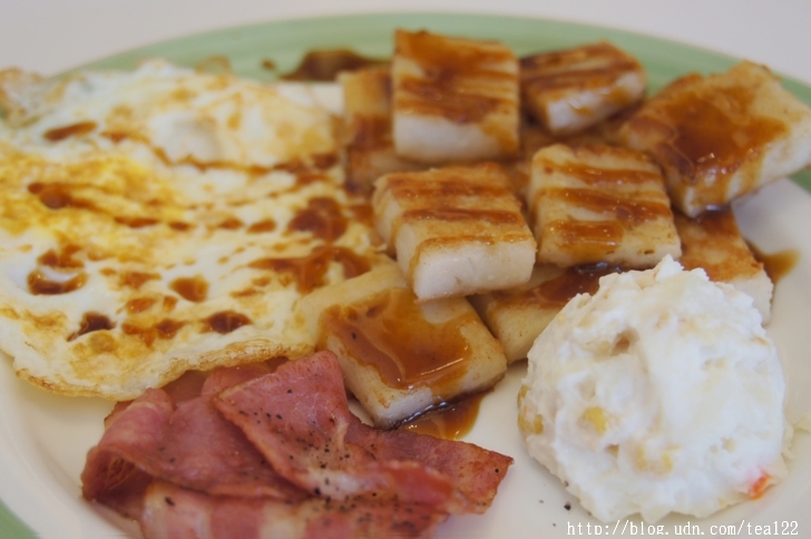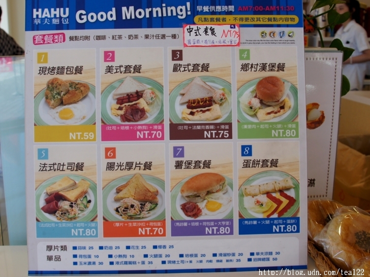 這裡不僅只有提供麵包而已,像我平日常吃的蛋餅也有賣,外加馬鈴薯、火腿、起司、飲料(咖啡、紅茶、奶茶、果汁任選一種),售價80元;老爺子的最愛也有,中式套餐蘿蔔糕、荷包蛋、培根、薯泥、飲料,賣75元;更別說大家常見的歐式套餐(吐司、法蘭克香腸、滑蛋),加上飲料75元,美式套餐(吐司、培根、小熱狗、滑蛋、薯泥)含飲料70元,看到這,想來螢幕前的你也會心動吧。