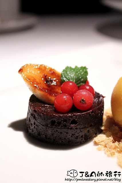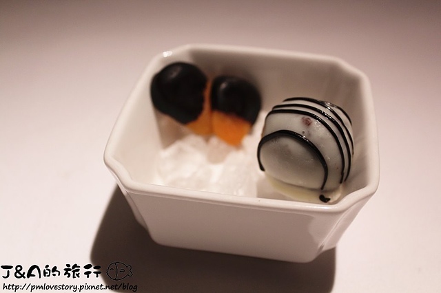 吃完主餐後在上甜點之前會先送上一點巧克力和飲品的部分,