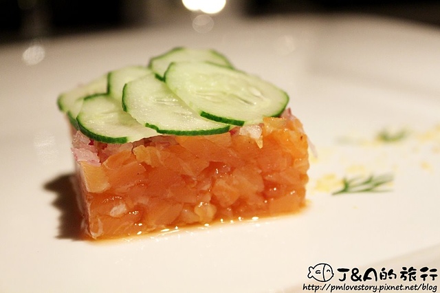 以切成細小塊的燻鮭魚搭配上黃瓜片和紅洋蔥,