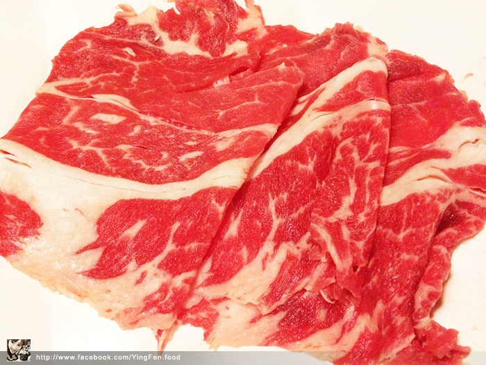 小羊肩肉(紐西蘭)白色脂肪少,紅色肉比較多,建議肉片都放在麻辣鍋,味道比較重也很香,小羊肩肉吃起來沒有太重的羊騷味。