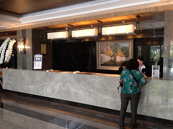 這是購票櫃台,服務人員會詢問是否需要購買套組,例如門票+餐飲,或者水療。