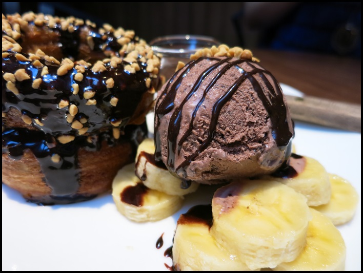 我們點香蕉巧克力可拿滋,就是甜甜圈狀的可頌油炸後叫做「可拿滋」,