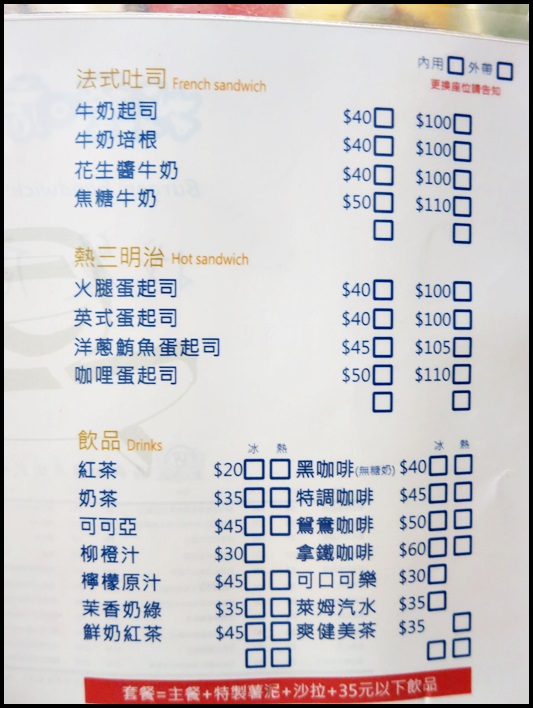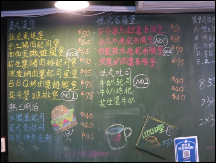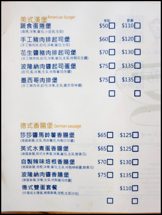 主要是四種主餐:漢堡、香腸堡、法式土司、熱三明治