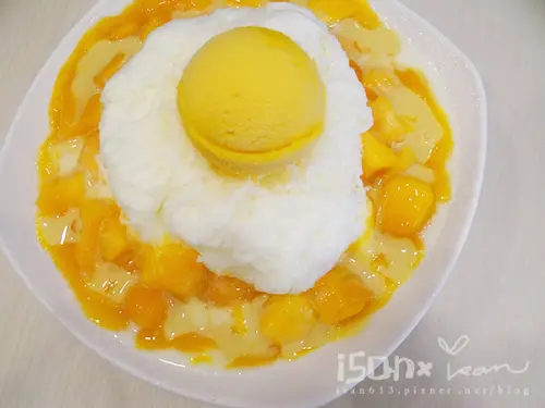 「新鮮芒果雪花冰」雪白的雪花冰外圍著黃澄澄的芒果果肉和頂端的芒果雪酪,在夏天裡看到這樣的東西都清涼了起來。