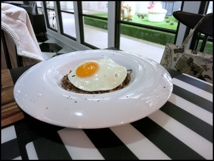 奶油起司培根蛋可可義大利麵,荷包蛋是故意蛋黃不熟,