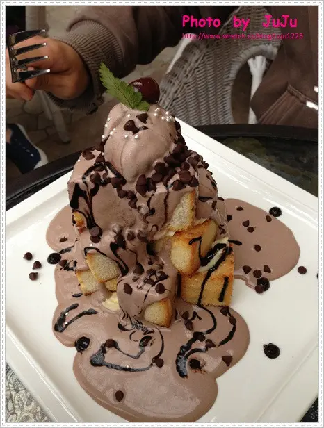 金字塔的磚塊是切成方型塗上奶油烤過的吐司,中心有卡士達醬把他們黏起來,外層淋上鮮奶油和兩種莓果醬,頂端放上一球香草冰淇淋,最後在灑上糖粉裝飾,如果你曾經被朋友用嗜甜的螞蟻形容,那絕對絕對要吃吃跳舞香水的蜜糖吐司,真的是甜得好好吃呀──!比起巧克力和草莓據吃過的朋友說這兩種口味是單純的甜,這道覆盆子口味的就是甜中帶酸,吃多了比較不會膩的感覺~