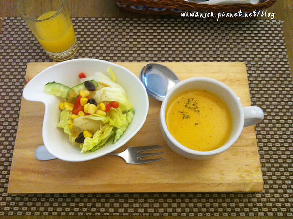 濃湯是南瓜口味~很適合早上喝 暖暖胃~