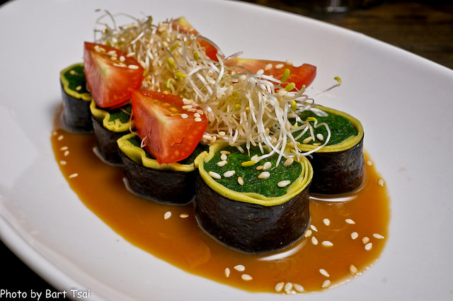 整個菠菜卷非常費工,最外層是海苔,中間包著蛋皮,再捲上菠菜