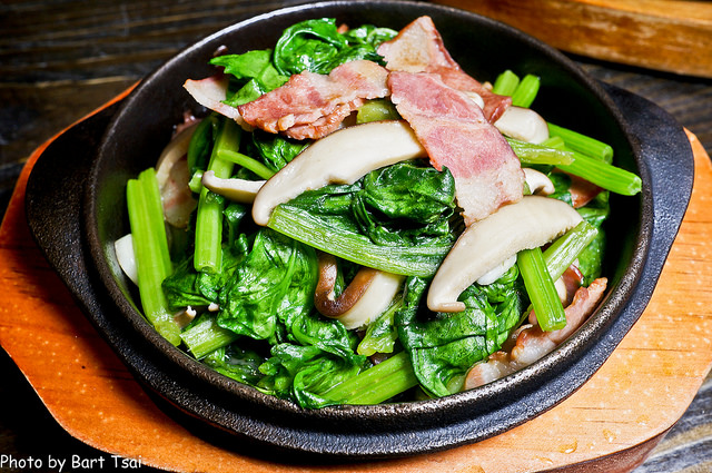 那來道蔬菜吧。這道剛上來時會擔心底下鐵板把菠菜弄焦,不過吃完看來還好,培根和鮮香菇與菠菜的搭配不錯,蠻好吃的