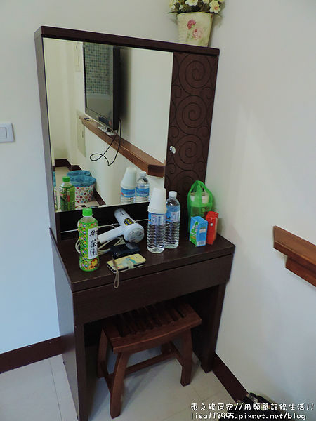 有張小小的梳妝台(請無視雜亂的桌子...),旁邊跟抽屜也都可以放東西