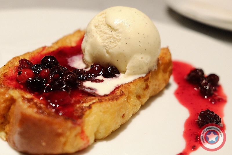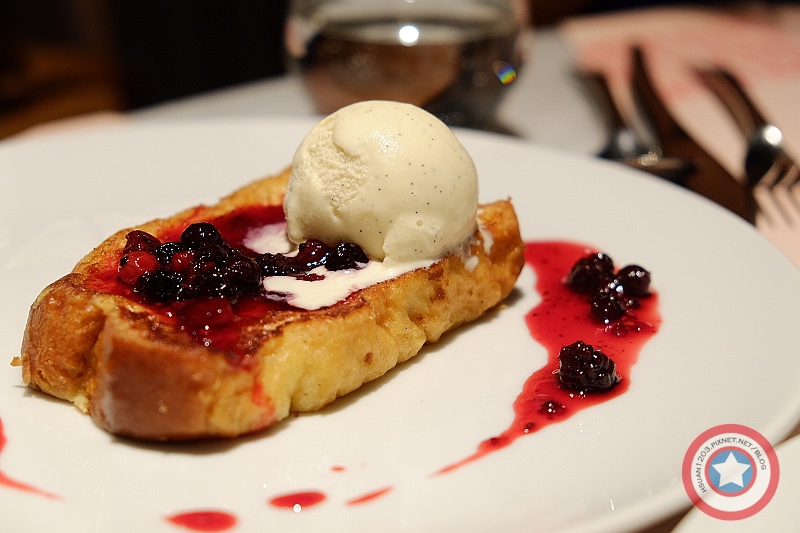 布里歐土司做成法式吐司那樣 上頭放著香草冰淇淋並淋上野莓果醬
