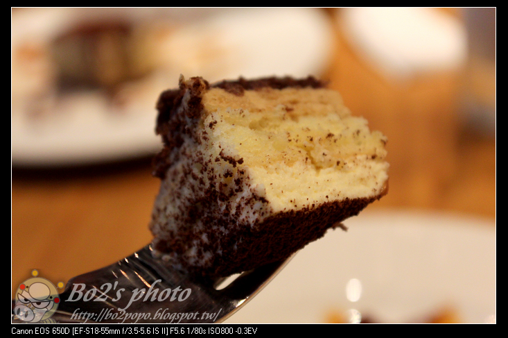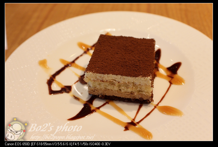餐後甜點是提拉米蘇,加上巧克力跟焦糖淋醬看起來頗為繽紛。