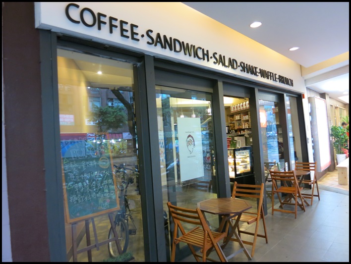 明亮的店面,門口擺放的是最近咖啡店流行的木質桌椅
