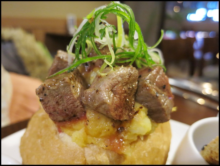 骰子牛漢堡這樣擺盤很搶眼,還用馬鈴薯沙拉黏在漢堡上,