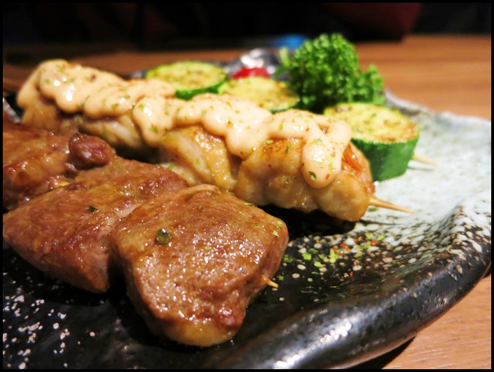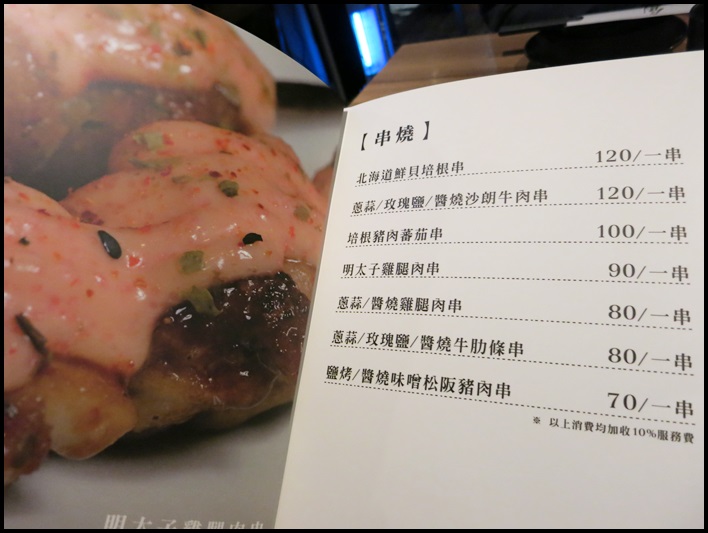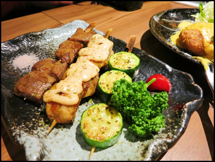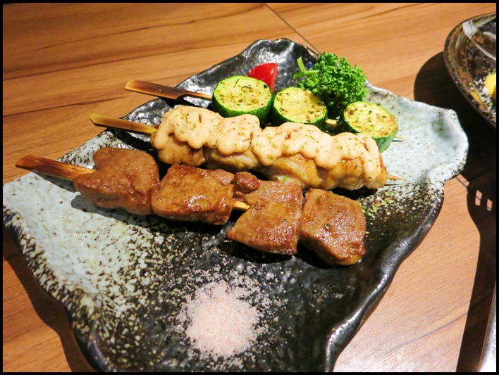 這裡點的是玫瑰鹽沙朗牛肉串、明太子雞腿肉串、義式櫛瓜串