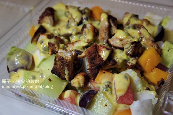 雞肉一樣剪小塊加熱後放在水果沙拉上,淋上百香優格醬....