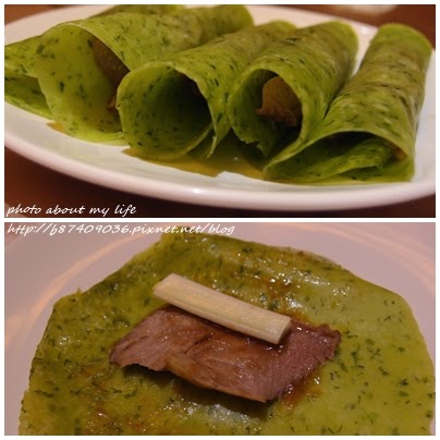 脆綠的三星蔥餅皮是主廚的創意 厚了點所以比較韌 跟鴨肉搭在一起很有咬勁(笑)