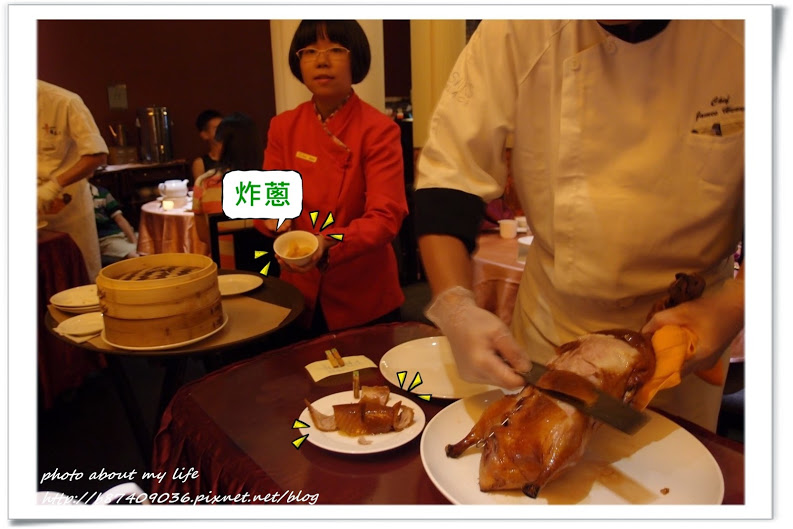 主廚片鴨的同時還有專人特別解說招牌的三星蔥餅皮和炸蔥