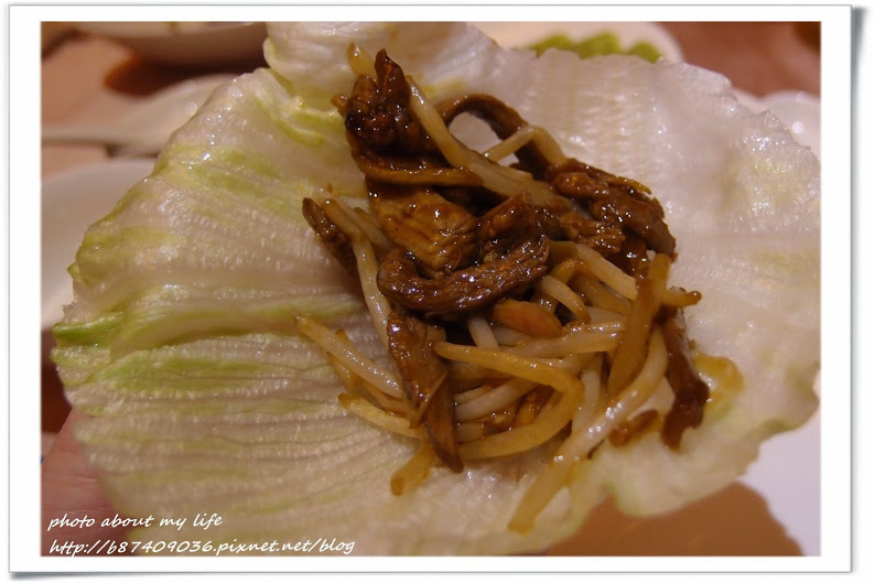 唯一有蔬菜的生菜包鴨絲 炒鴨肉不管顏色和口感都頗像牛肉 咬起來比烤鴨肉更油韌了些